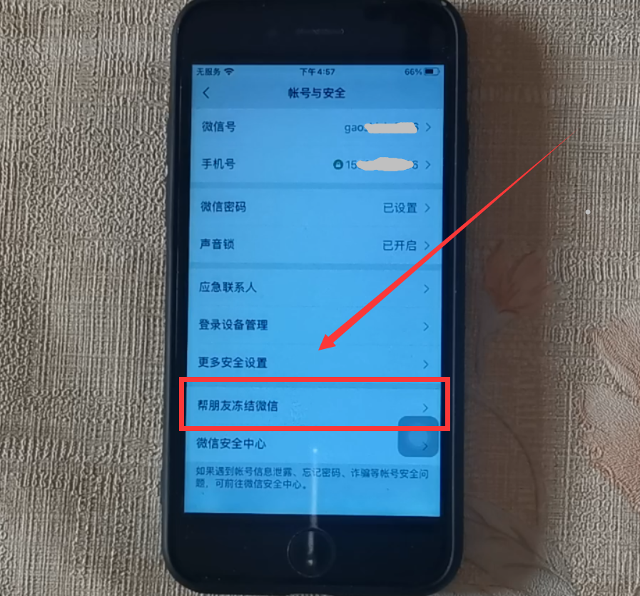 在这个界面,多出来了一个“帮朋友冻结微信”的选项,点击它,就进入“帮朋友冻结微信”的界面(如下图)。